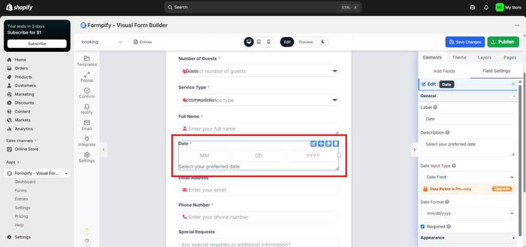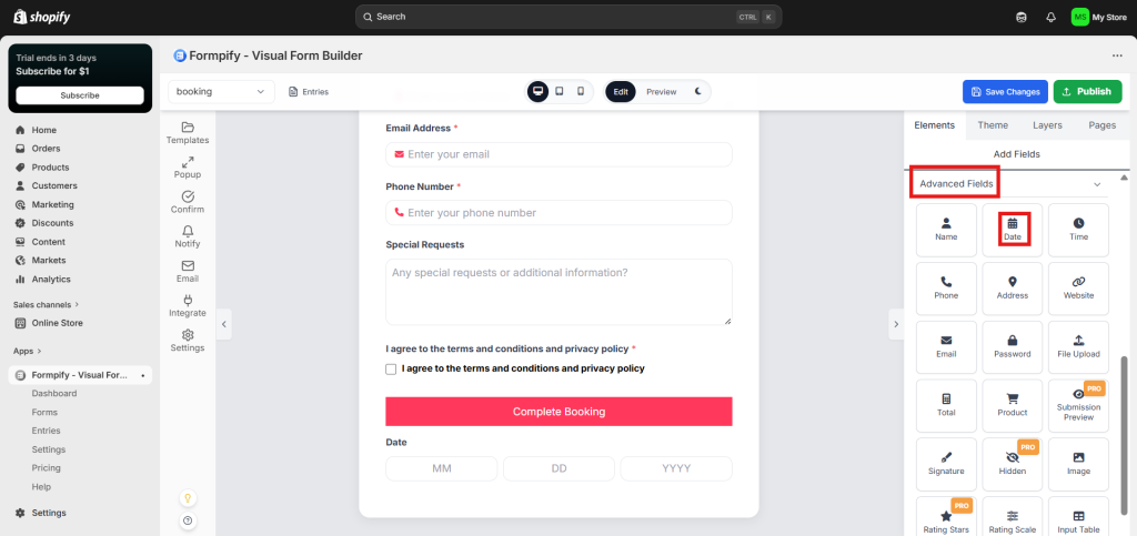 - Click Date to add it to your form