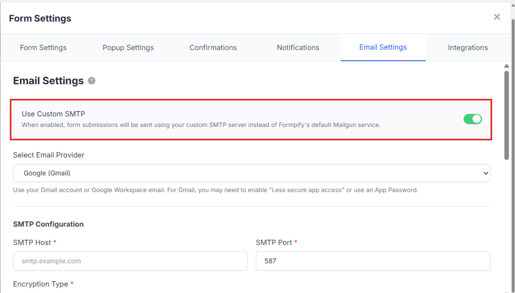 When enabled, form submissions will be sent using your configured SMTP server instead of the default Mailgun service.