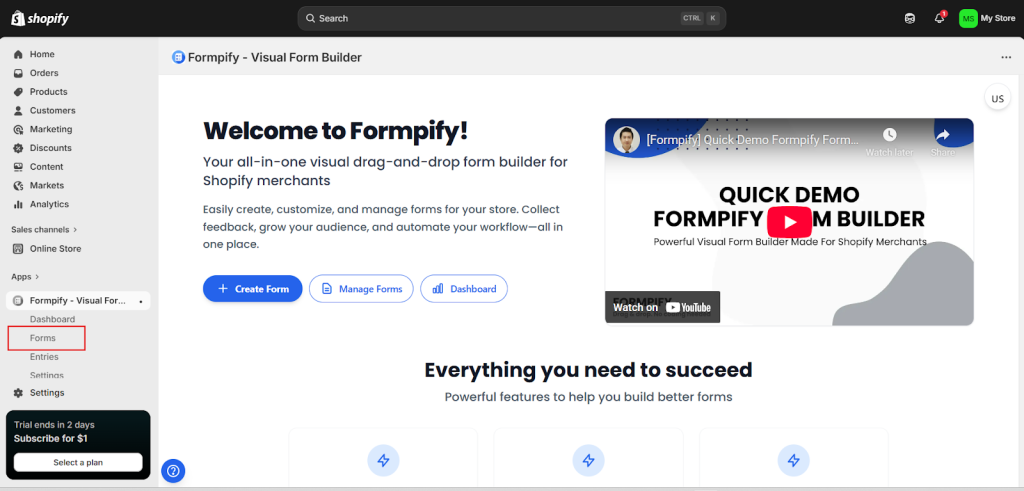 - From the Shopify Admin dashboard, navigate to Apps -> Formpify-Visual Form Builder.