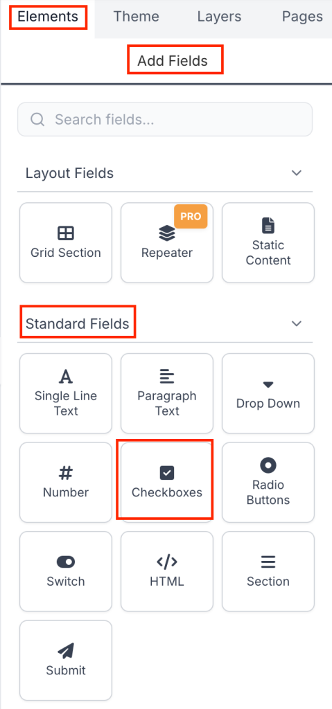 In the right-hand panel, open the Elements tab. Under Standard Fields in the Add Fields section, click on Checkboxes to add it to your form.