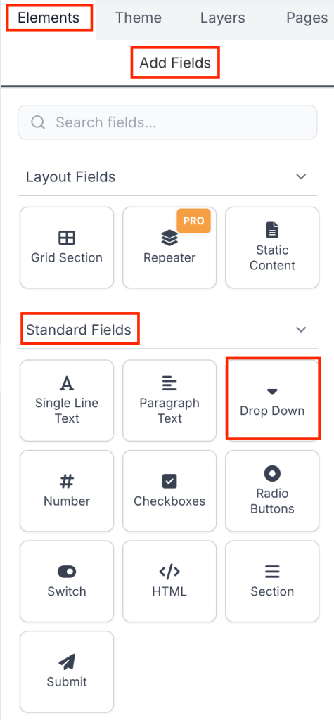 In the right-hand panel, open the Elements tab. Under Standard Fields in the Add Fields section, click on Drop Down to add it to your form.
