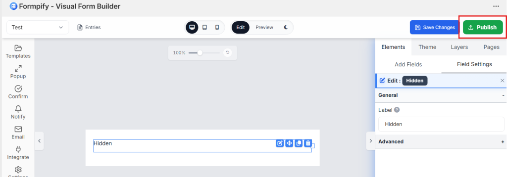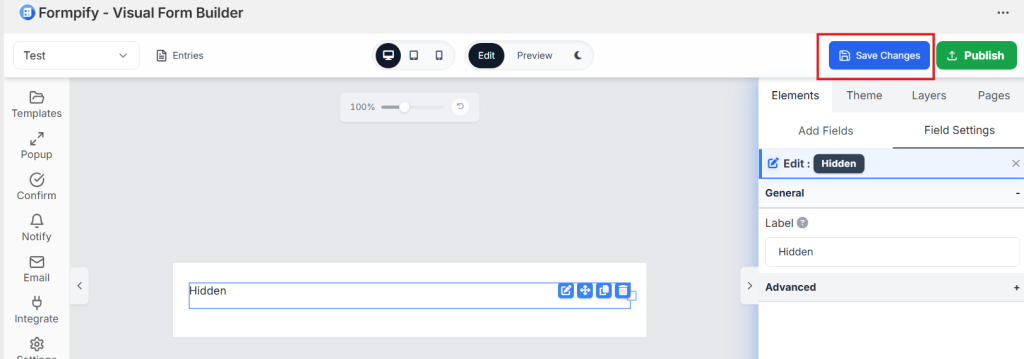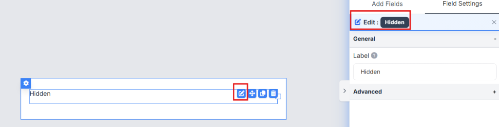 Click the Edit (pencil) icon on the Hidden field to open the settings panel.