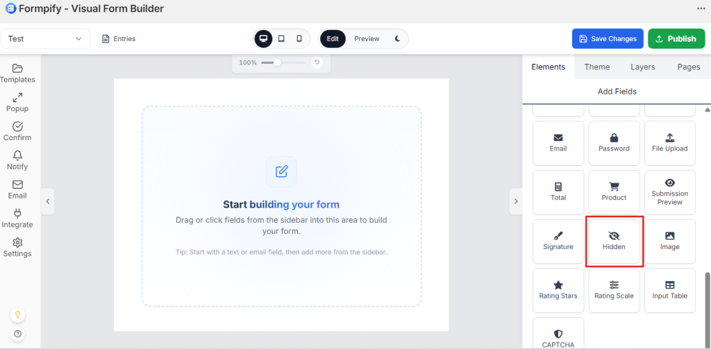 In the right panel, open the Elements. Under Advanced Fields, click Hidden