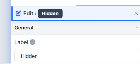 Label: Defines the name of the Hidden field displayed on the form. Set the label for this field. This will be displayed to users.
