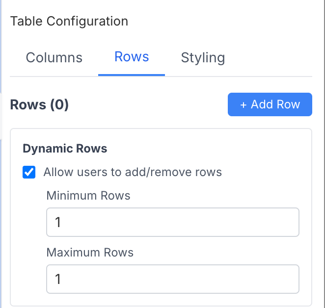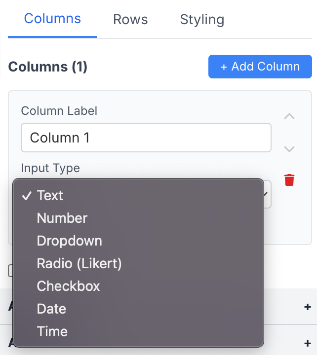 And you can also customize: Column Label, Input Type (Text, Number, Dropdown, Radio, Checkbox, Date, Time) of the table the following image below
