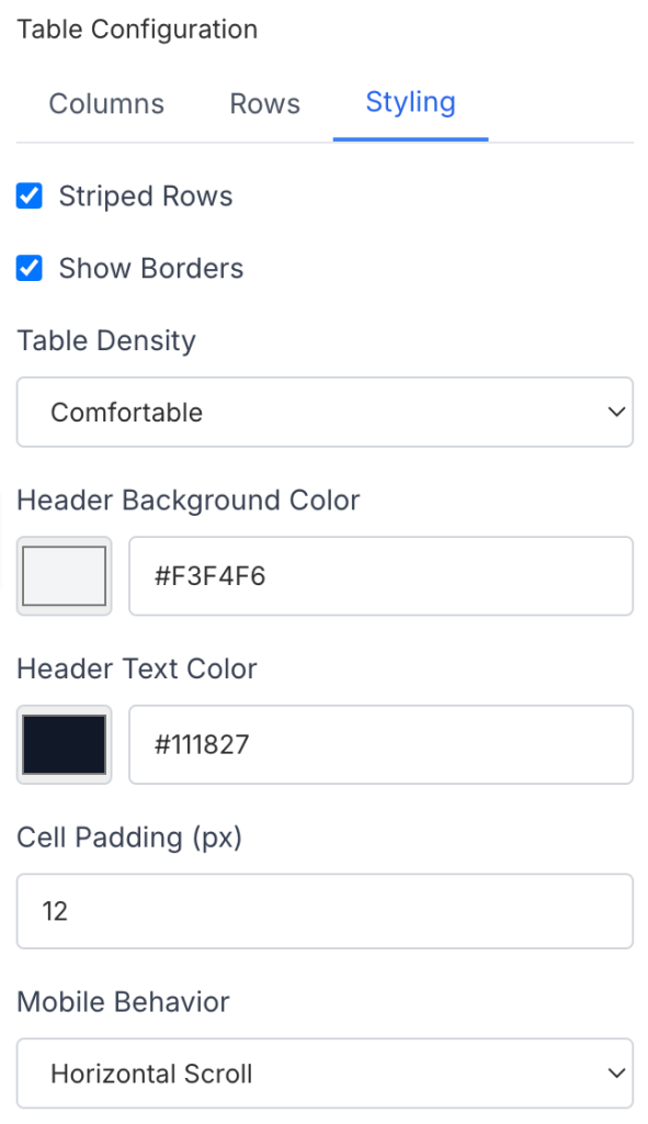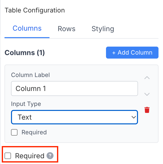- Columns: Click on “Add Column” to add column on table. You can change Column Label and select Input Type as desire