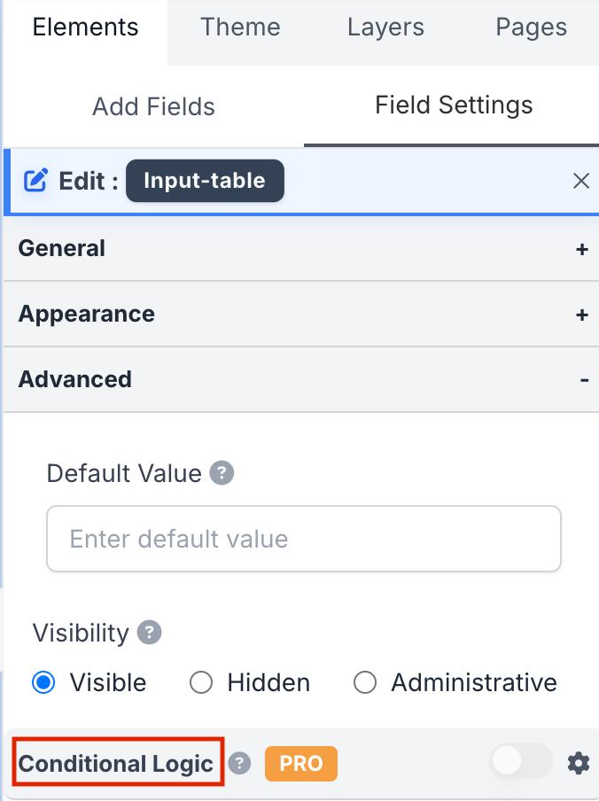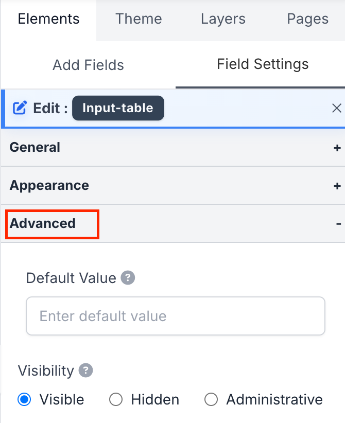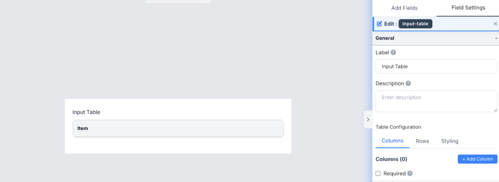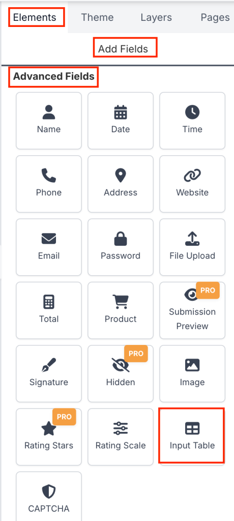 In the right-hand panel, open the Elements tab. Under Advanced Fields in the Add Fields section, click on Input Table to add it to your form.