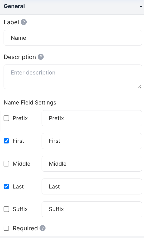 - Name Field Settings: customize visible of the name (Prefix, First, Middle, Last, Suffix)