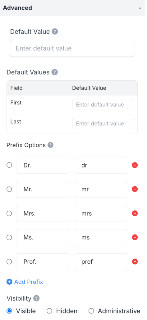 - Visibility: Set the visibility of this field. Options: Visible, Hidden, Administrative
