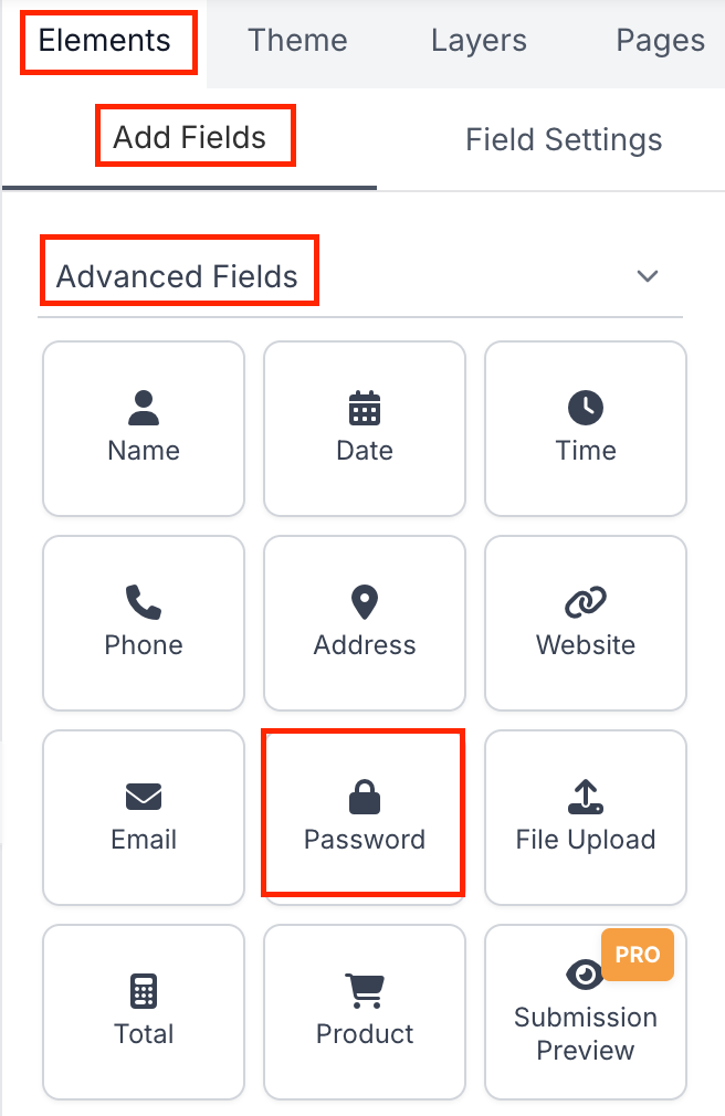 In the right-hand panel, open the Elements tab. Under Advanced Fields in the Add Fields section, click on Password to add it to your form.