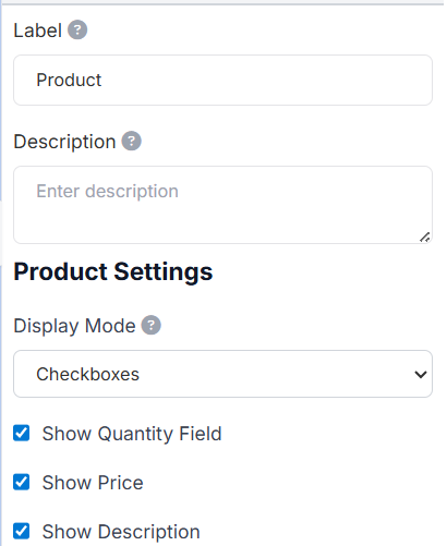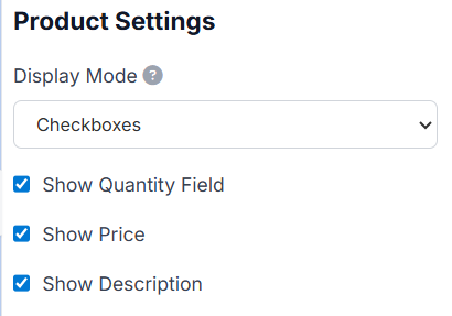 Product Settings: This section controls how products are displayed and how users interact with them in your form.
