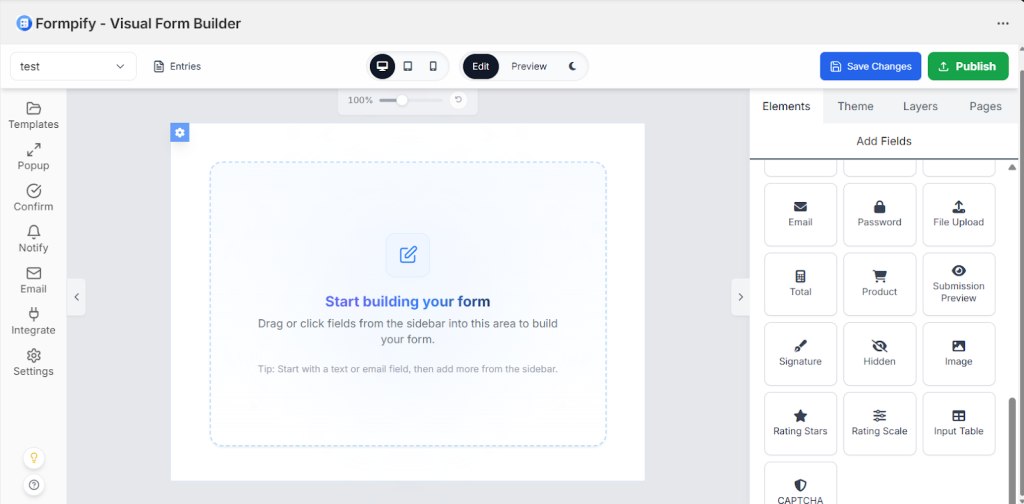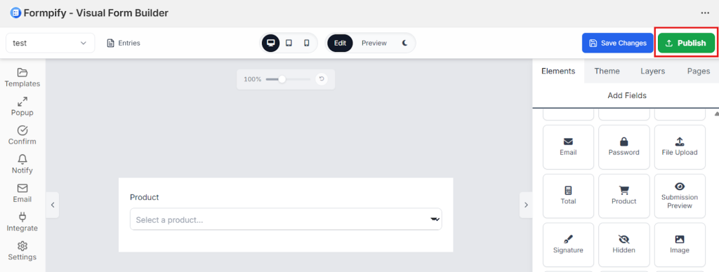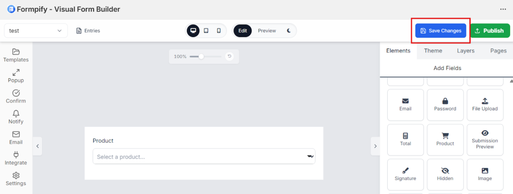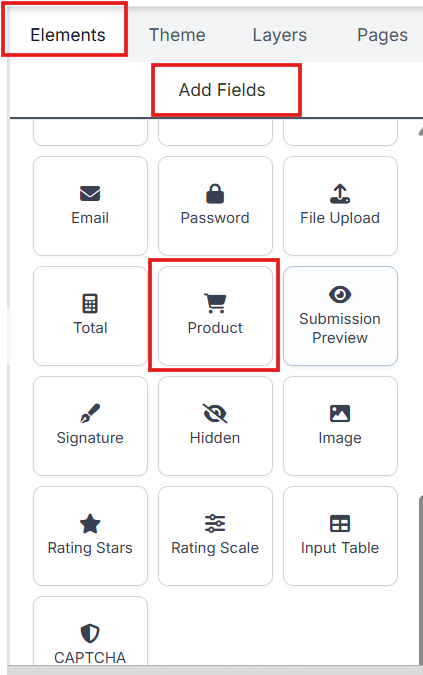 In the right-hand panel, open the Elements tab. Under Standard Fields in the Add Fields section, click on Product to add it to your form.