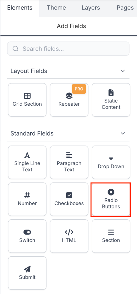 In the right-hand panel, open the Elements tab. Under Standard Fields in the Add Fields section, click on Radio Buttons to add it to your form.