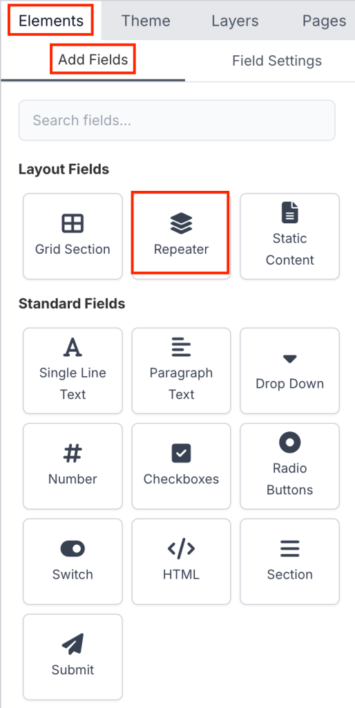 In the right-hand panel, open the Elements tab. Under Layout Fields in the Add Fields section, click on Repeater to add it to your form.