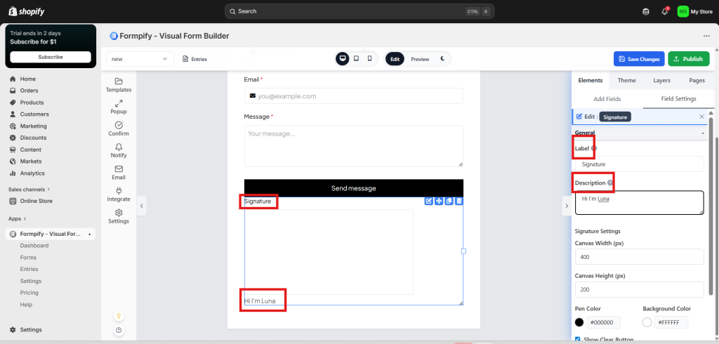 Description → e.g., Please sign to confirm (optional)