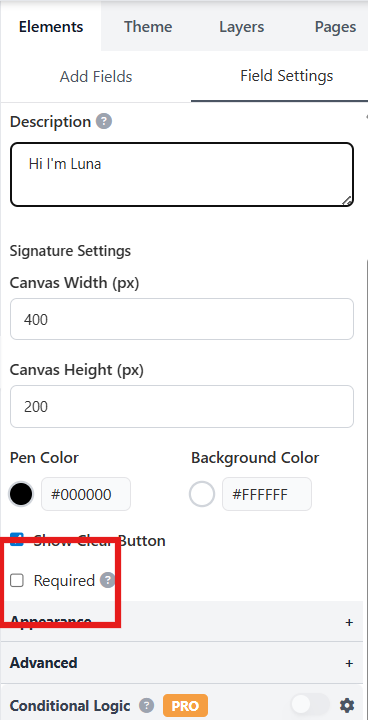 Required → enable if users must sign before submitting