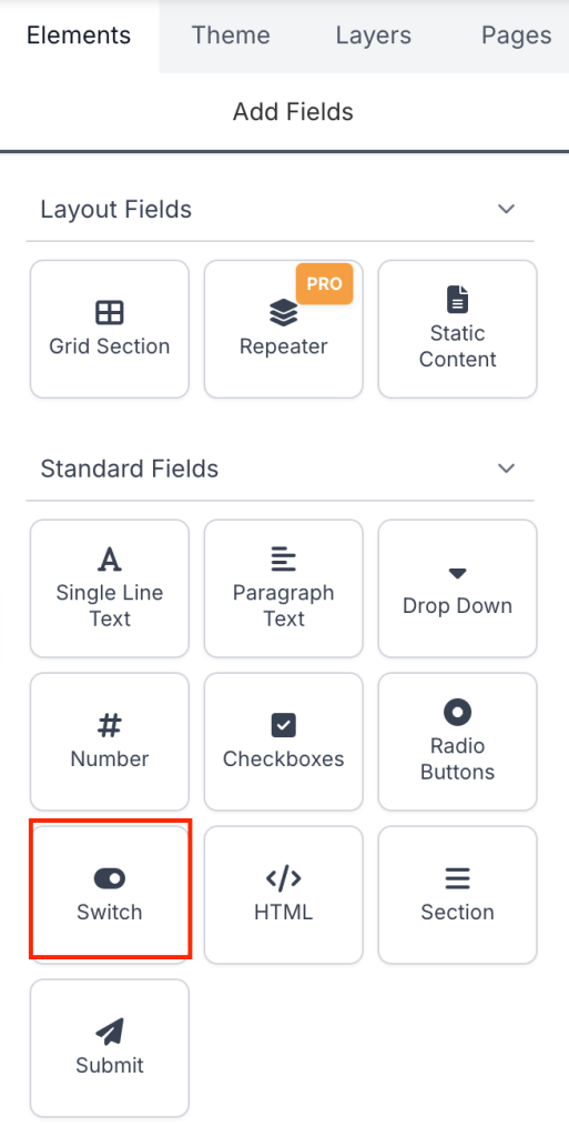 In the right-hand panel, open the Elements tab. Under Standard Fields in the Add Fields section, click on Switch Buttons to add it to your form.