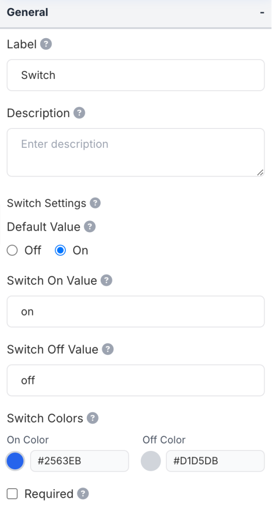 - Switch Settings: Configure the switch field settings including default value, colors, and custom values