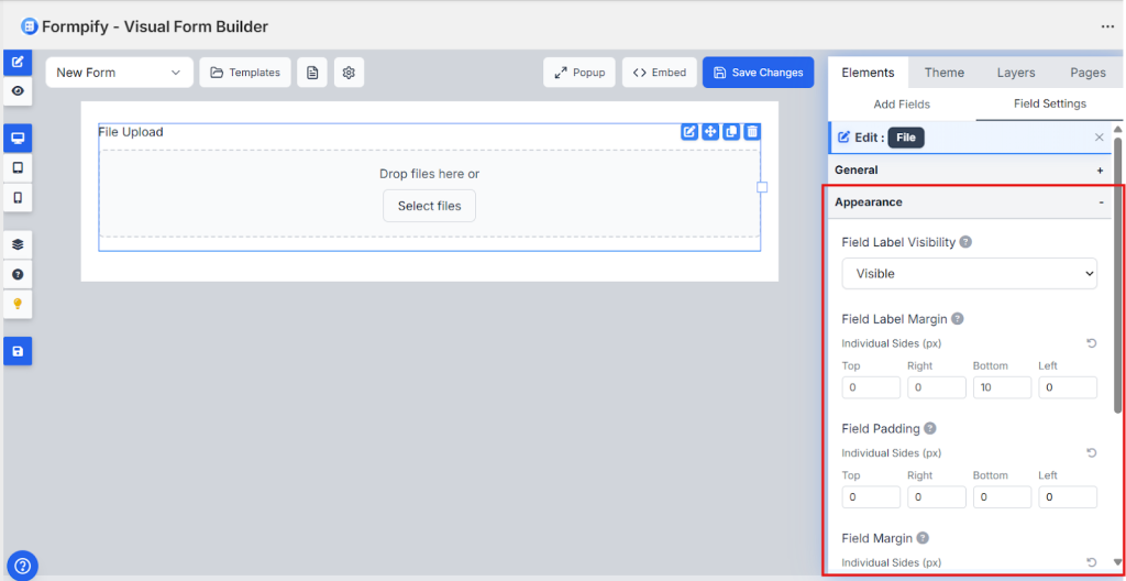 The Appearance tab allows you to customize how the File Upload field is displayed on the form.