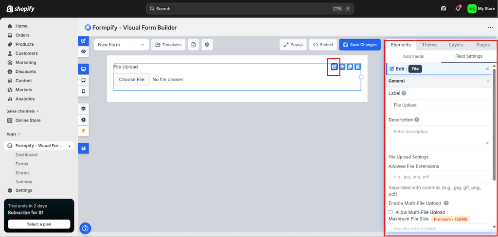 Click the Edit (pencil) icon on the Upload field to open the settings panel.