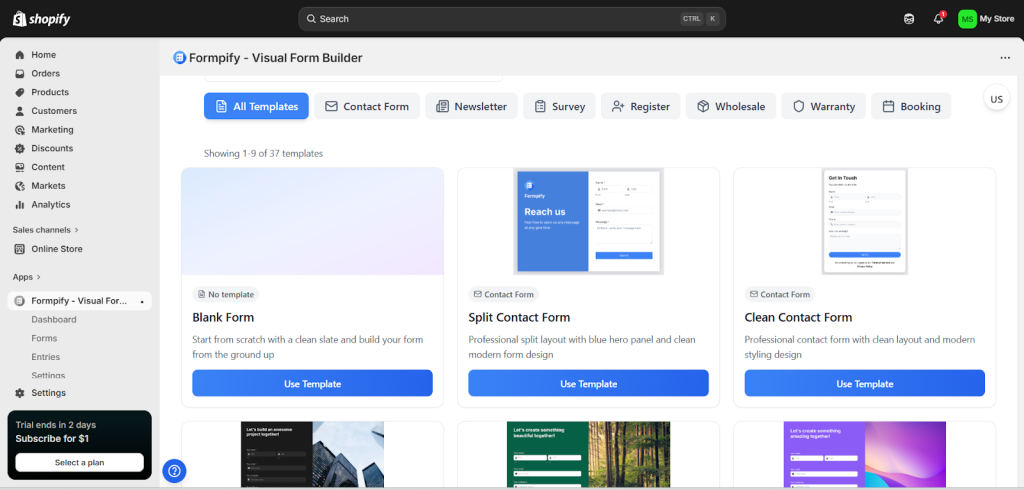 - From the Shopify Admin dashboard, navigate to Apps -> Formpify-Visual Form Builder.
