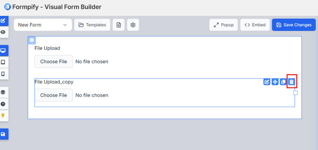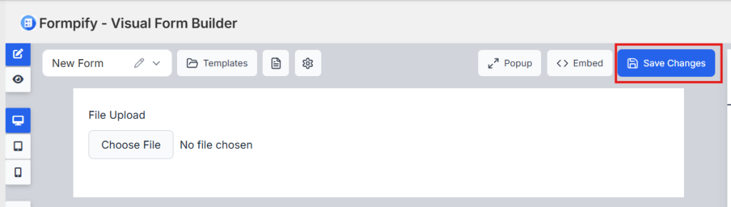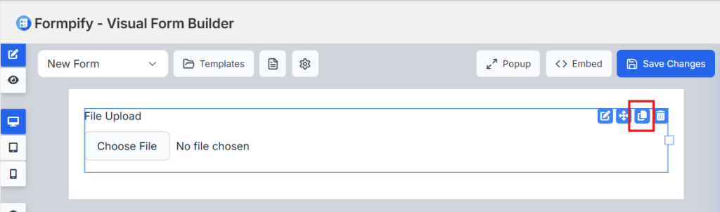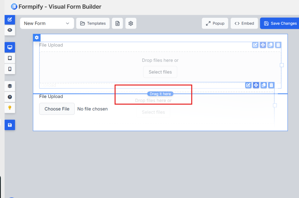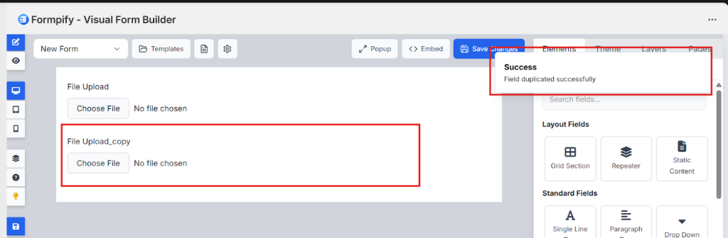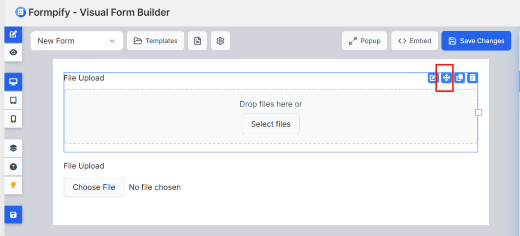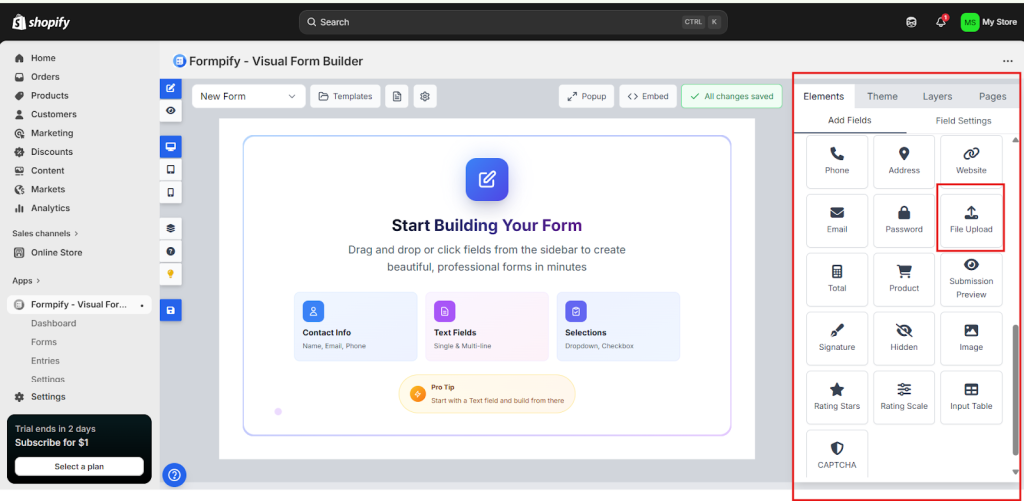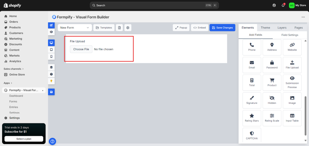In the right panel, open the Elements tab. Under Basic Fields, click File Upload.
