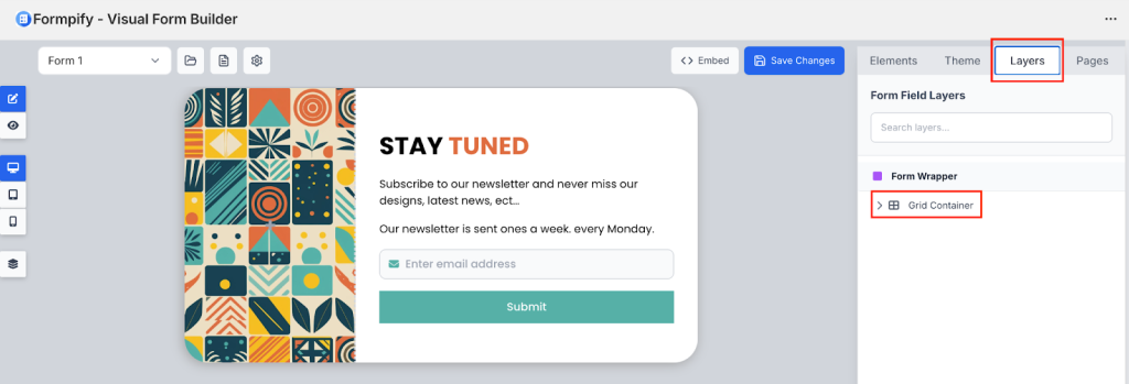 - When you hover over a field in the Layers panel, the corresponding field is highlighted in the form.