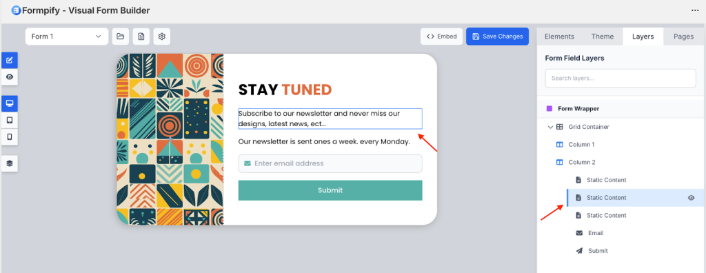 - For example, when you hover over the Static Content field, a blue highlight will appear on that field in the form.