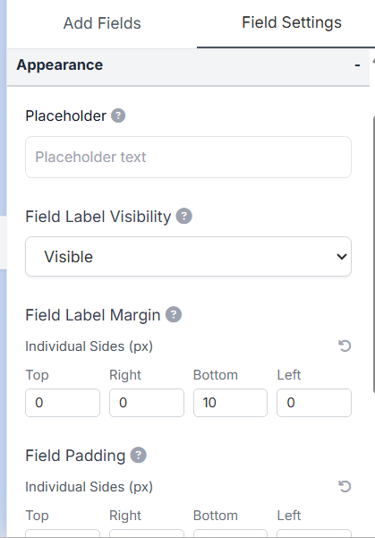 Field Label Margin: Controls the spacing around the field label (outside spacing).