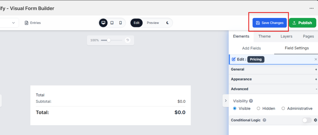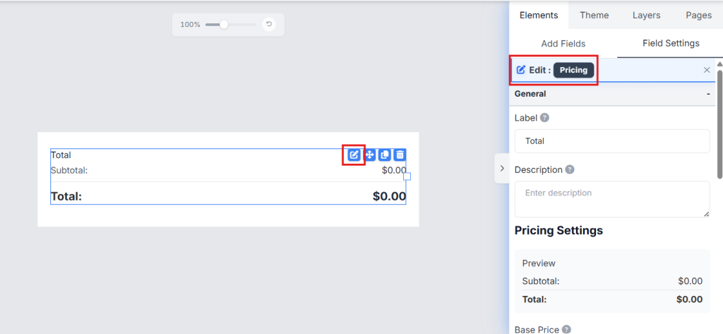 Click the Edit (pencil) icon on the Total field to open the settings panel.