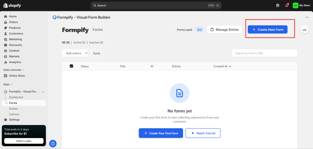 - From the Shopify Admin dashboard, navigate to Apps -> Formpify-Visual Form Builder.