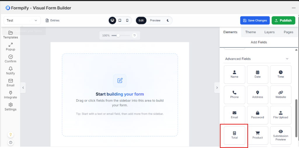 In the right panel, open the Elements. Under Advanced Fields, click Total